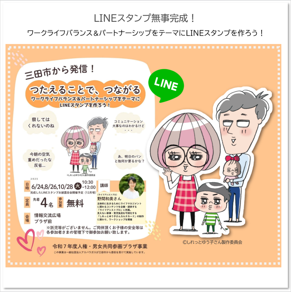 三田市人権・男女共同参画プラザ主催事業として、半年間にわたり進めてきた一大プロジェクト。 「三田市から発信!ワークライフバランス&パートナーシップをテーマにLINEスタンプを作ろう!」