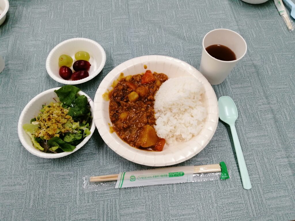 お待ちかねのごはんタイムは、甘口カレー🍛とグリーンサラダ、デザートのぶどう。