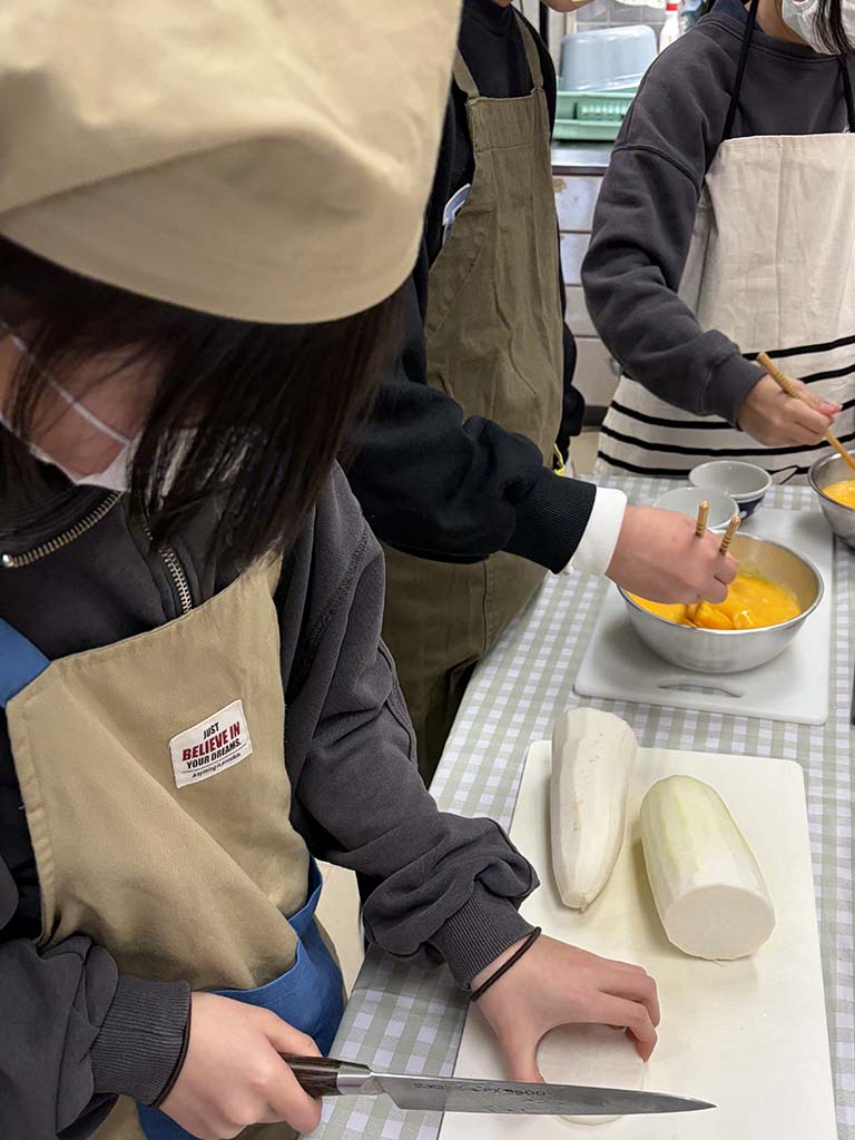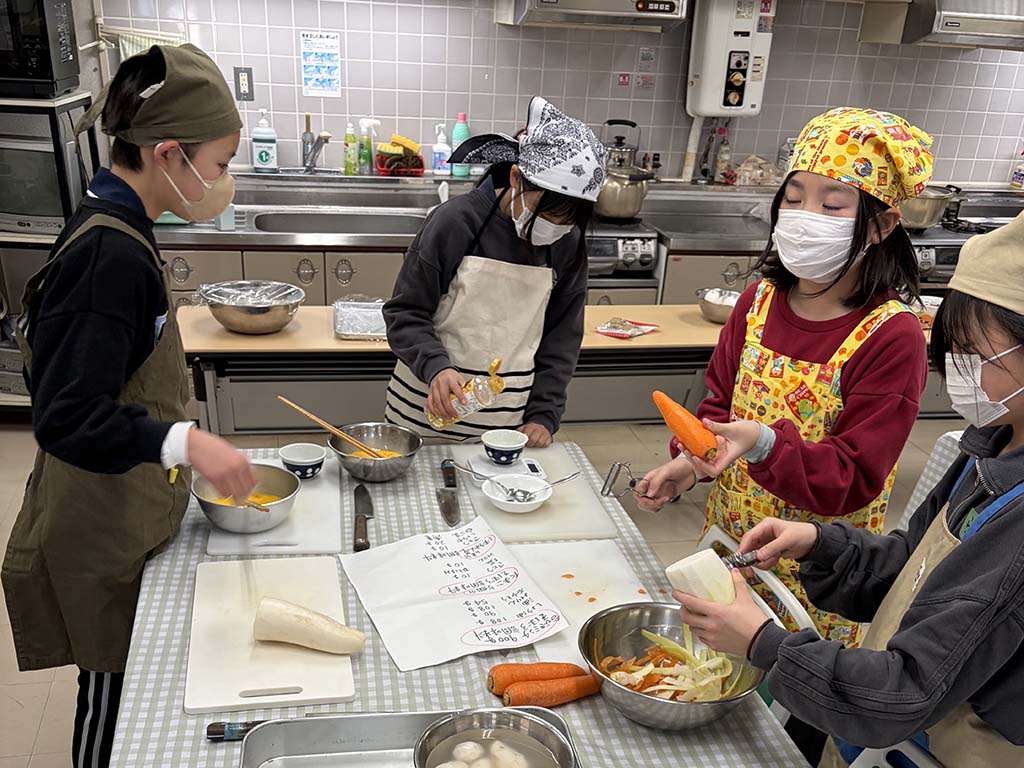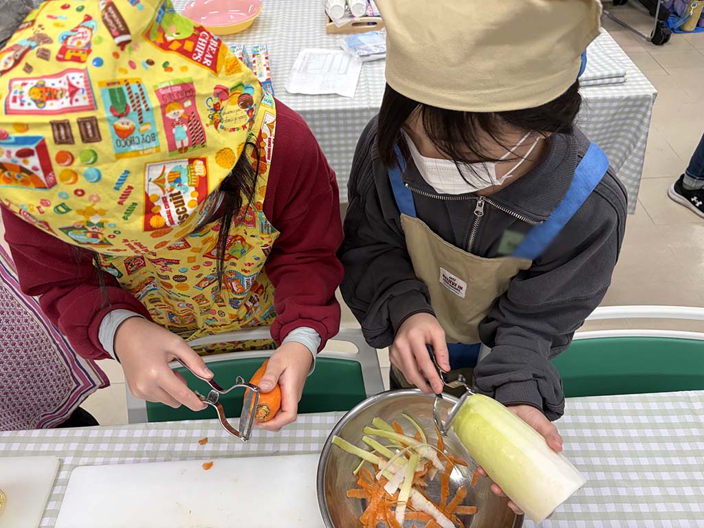 高学年は大根や人参を手際よく包丁でカット。見事な包丁さばきに、思わず拍手が起こる場面も👏